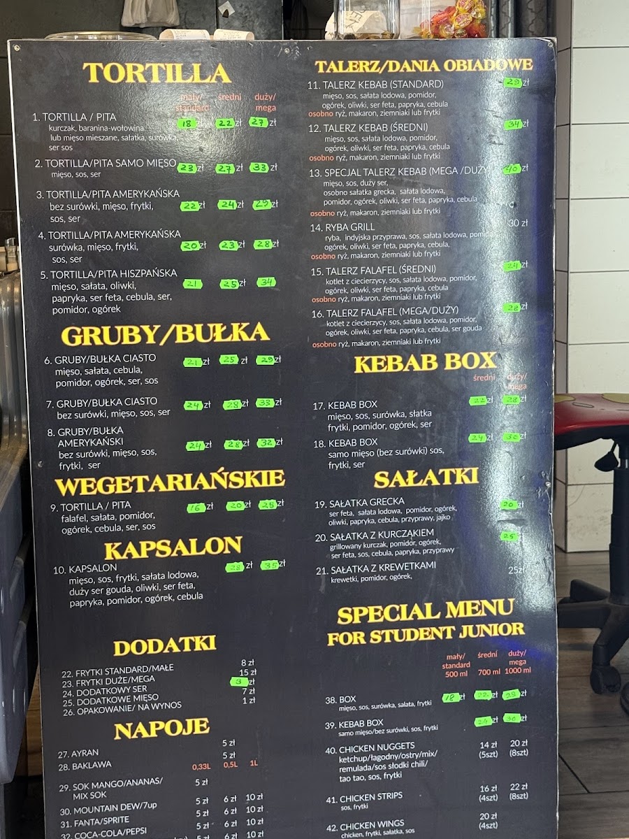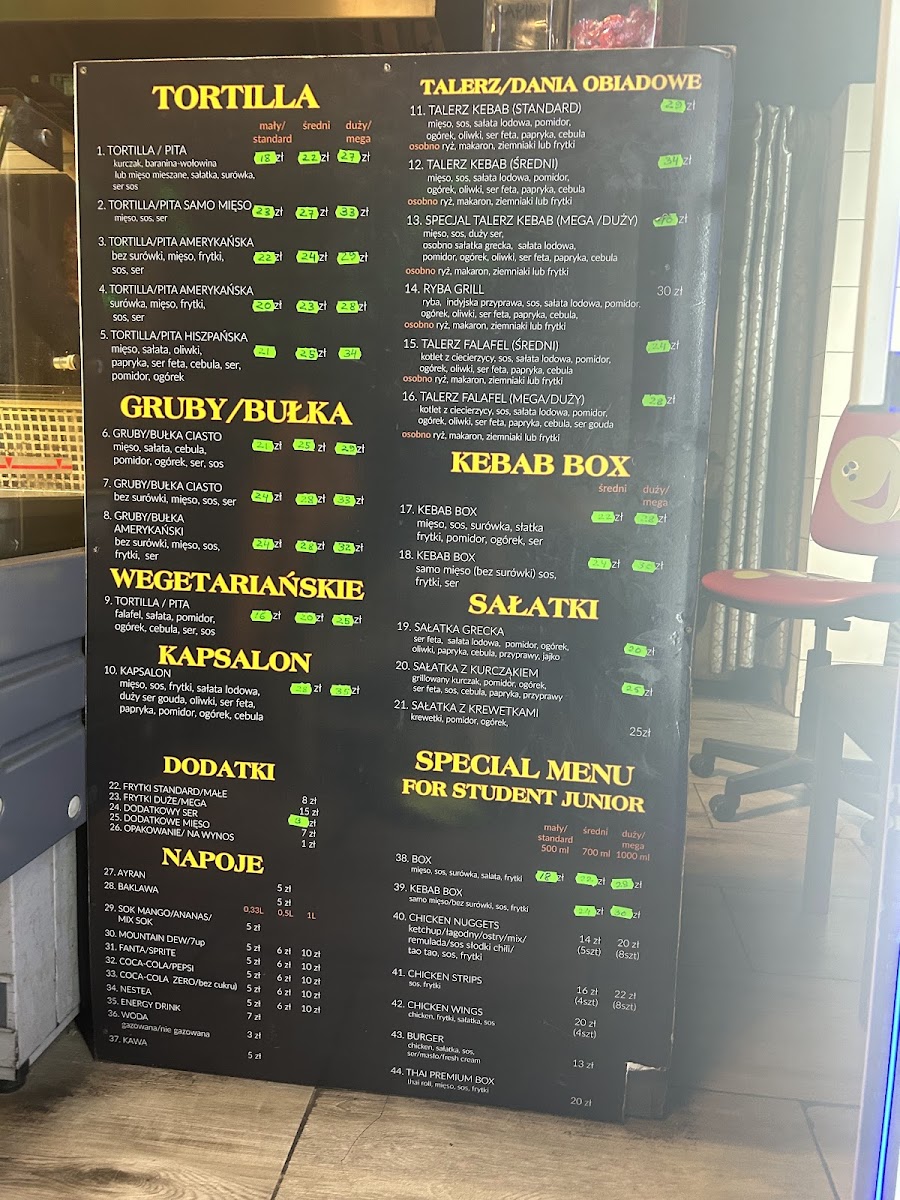 Among the favorites are options like the Duży Kebab Pita and the generously filled Tortilla Mega, alongside other comforting choices such as the Kebab Box and fresh Salatki. These dishes are perfect for a variety of occasions—whether a quick lunch, a casual dinner, or a shared meal with friends after a day out.